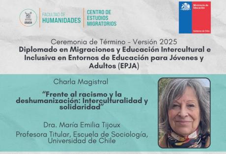 El pasado 29 de abril, el Centro de Estudios Migratorios de la Universidad de Santiago de Chile (CEM-USACH) llevó a cabo la ceremonia de clausura del "Diplomado en Migraciones y Educación Intercultural e Inclusiva en Entornos de Educación para Jóvenes y Adultos (EPJA)" en su versión 2025, programa ejecutado en colaboración con el Ministerio de Educación (MINEDUC). La actividad, desarrollada en modalidad online, reunió al equipo de la Coordinación EPJA de MINEDUC, al cuerpo docente del Diplomado y a sus estudiantes. El momento central de la jornada fue la clase magistral de la Dra. María Emilia Tijoux, titulada "Frente al racismo y la deshumanización: interculturalidad y solidaridad".