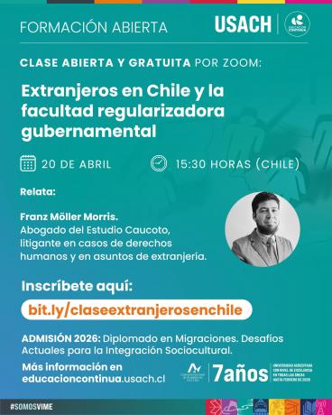 Les invitamos cordialmente a la clase abierta y gratuita: "Extranjeros en Chile y la facultad regularizadora gubernamental", a realizarse este lunes 20 de abril, 15.30 Hrs., vía Zoom.